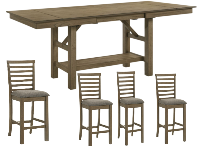 Set includes the gathering table and 4 slat back upholstered counter chairs