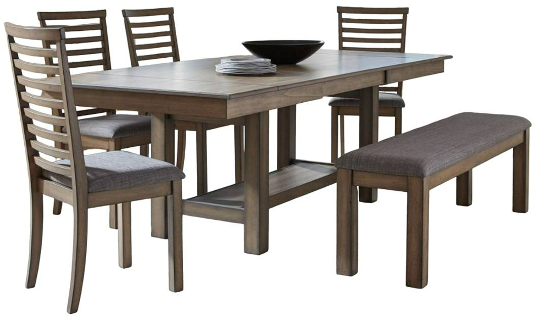 Set Includes: Gathering trestle table, one upholstered bench, and four upholstered ladder back side chairs