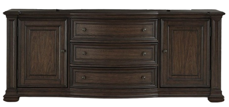 The serpentine shaping on the front of the case immediately captivates, introducing a graceful curvature that adds a touch of uniqueness to the console. The three drawers and two doors, framed with bead molding accents, showcase meticulous craftsmanship, creating a cohesive and refined look. Square block pilasters, adorned with graduated bead molding, stand tall and proud, adding depth and dimension to the console's design. These pilasters not only provide visual interest but also contribute to the overall flow of the piece, creating a sense of continuity. The square turned bun feet offer a sturdy foundation while maintaining the classic design aesthetic. One adjustable shelf behind each door ensures customizable storage, and wire management provisions add a touch of practicality, keeping your entertainment area organized and clutter-free. Elevate your entertainment space with the visually stunning Provence Park 78 inch TV console.