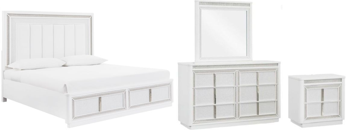 Includes queen upholstered headboard, storage footboard, rails and roll slats, dresser, mirror, and nightstand.