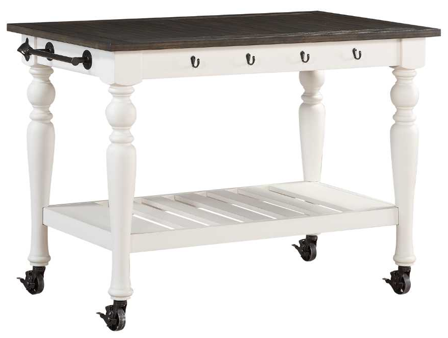 Classic farmhouse styling updated for today’s dining. Turned legs and pilasters combine with cup pulls to create a look that is both new and vintage. The Joanna Server Cart is both stylish and functional with hooks for hanging, handles for towels and for use as a push bar and slatted bottom shelf for additional storage.Read More